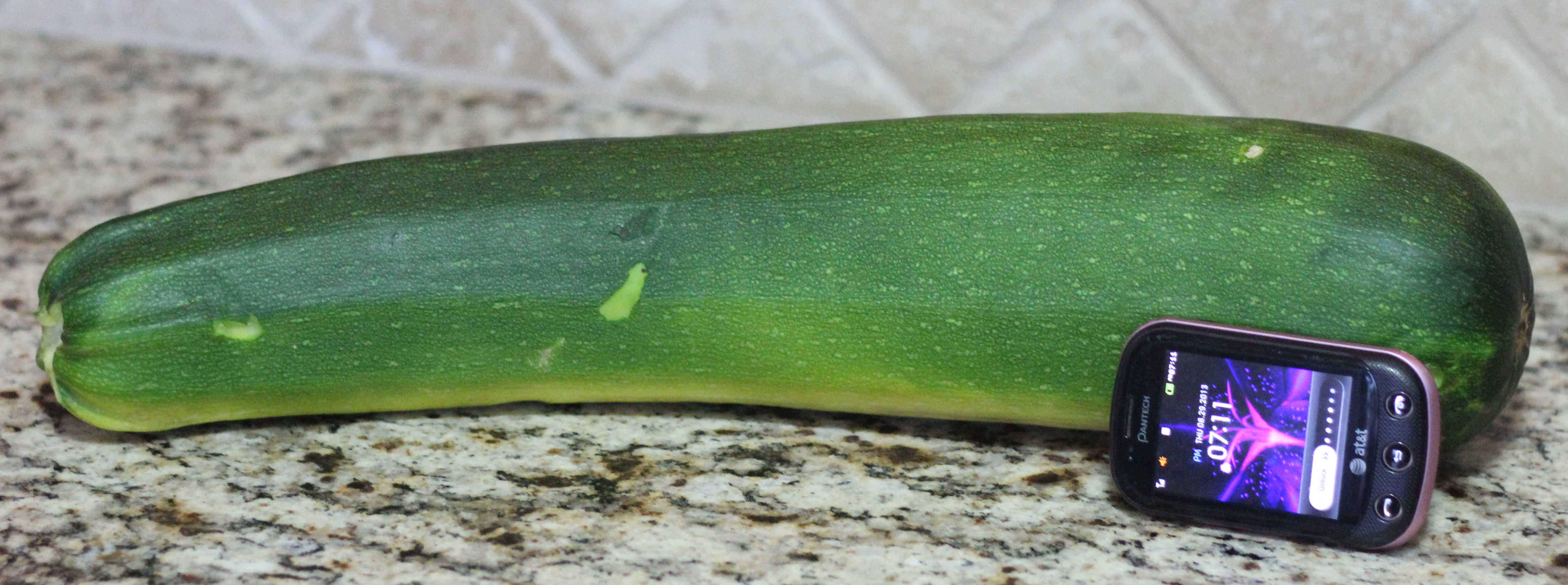 Kulow Homestead Forgotten By Andrea August 30, 2013 0 Comments This is what happens when you forget a zucchini… this one weighed 5 pounds 5 ounces, it was 19 inches long and 13 inches in circumference. This zucchini was cut up and made into muffins, zucchini cheesy cakes, and then some frozen for winter soups.