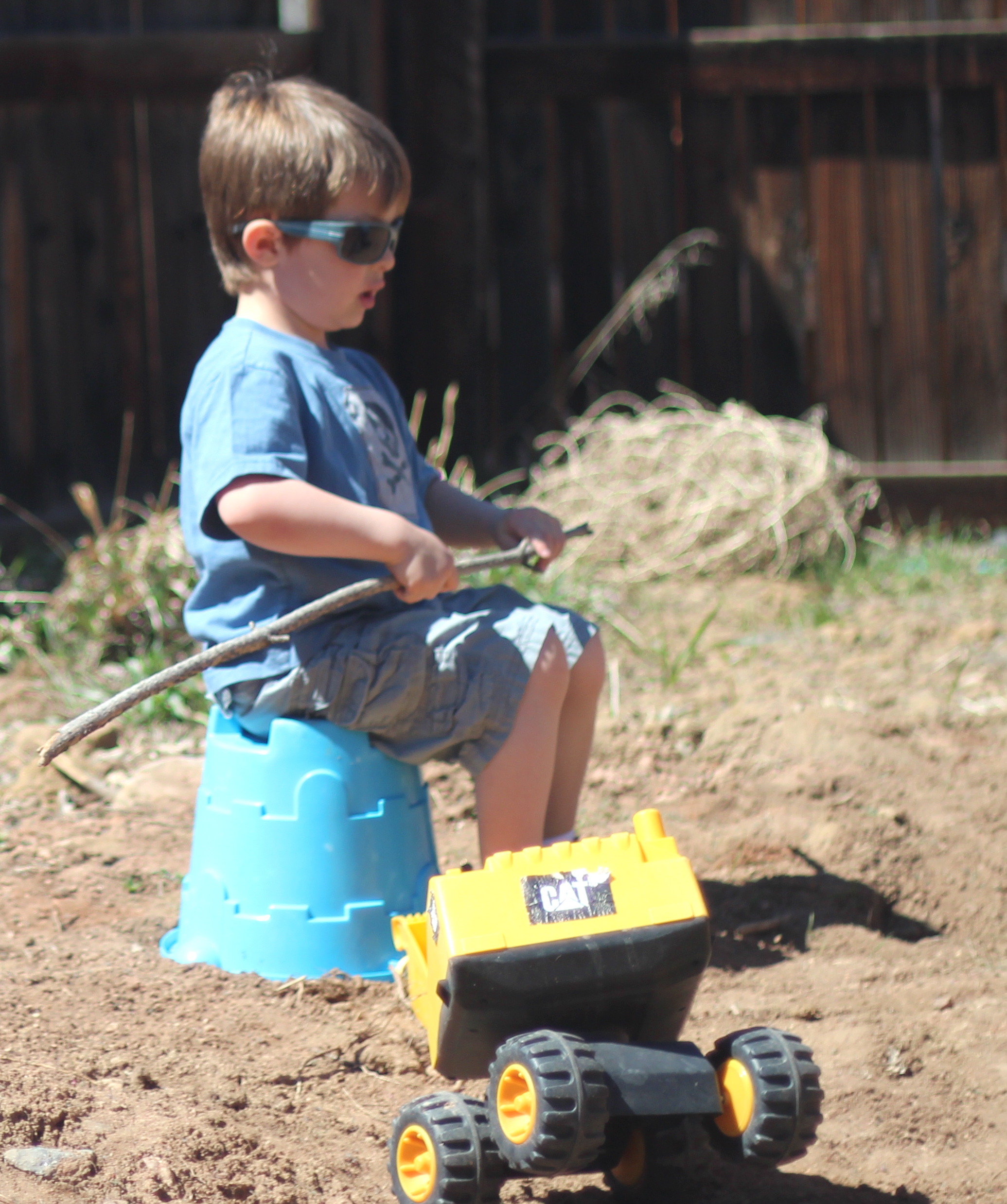 We have a general in our mix! Middle brother will often be found sitting down directing everyone in what they should be doing. The funny thing is that the other brothers usually listen to him. Today was such a super nice day so we all played in the yard. Daddy trimmed trees, I dug weeds, and brothers rode bikes and then decided to dig in the back yard. Right now the back half of our yard is just dirt, the perfect combination for three little dirt loving boys.