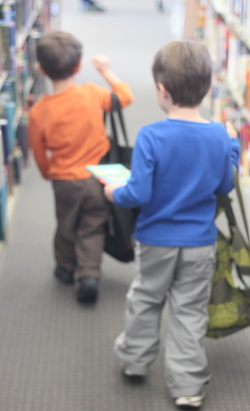 With snow on the ground the boys and I headed to our local library. The boys sat in story time and then wanted to jet from there to get their books. I thought the boys would really enjoy the story time, they read a few books, sing songs and then have a letter of the day lesson… needless to say my boys could have cared less! At one point during the story time middle brother came over and sat next to me and told me “this is lame, can we go?” Even little brother was not enticed by the songs, and usually he loves dancing and singing. Oh well I suppose! Walking through the library with my two little men is a large feat, they are basically running up and down the isles with their bags filling them until they can barely carry them. Today we walked out of the library with thirty six books for them, one for me and two DVDs. I am so grateful for the library and the ability to go and get as many books as we want. Such a cool resource as a mom!