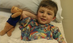 Today middle brother had surgery to have his ear tubes removed. He was the lucky less than 1% that has to have his tubes surgically removed. Last summer we were having troubles with his ears bleeding and the doctor said he would like to try to make it past flu season before we removed them. A few weeks ago they started bleeding again and another visit to the doctor confirmed that surgery was going to be needed. Thankfully we were able to get into a cancellation spot and so he went in today to have them removed. Here in Colorado we have been having snow storm after snow storm with really cold temperatures and today was no different. Hubby took him and it wound up taking over two and a half hours to get to the hospital, which usually is about a forty-five-minute drive. I was worried that they would say they couldn’t do surgery because we were so late. Thankfully that was not the case! Brother took a little medicine nap and thirty minutes later his tubes were removed and he has two patches in each ear. Unfortunately, I slipped on some ice yesterday and sprained my ankle pretty bad so I was not able to be there with him at all, made my mommy heart uber sad. Daddy did snap a picture pre-surgery for me and kept me updated by text messages. Brother got home from surgery and was a little spacey, as was to be expected. He and I snuggled on the couch and watched Netflix all day. His ear started to hurt around dinner time so another dose of ibuprofen and he was fine. Glad to be rid of those darn tubes, they served him well for a while.